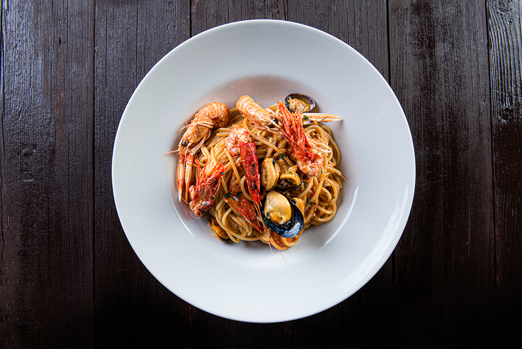 Cozze, vongole, calamaro, scampi, gamberi, sugo di pomodoro, aglio, olio, prezzemolo , peperoncino
